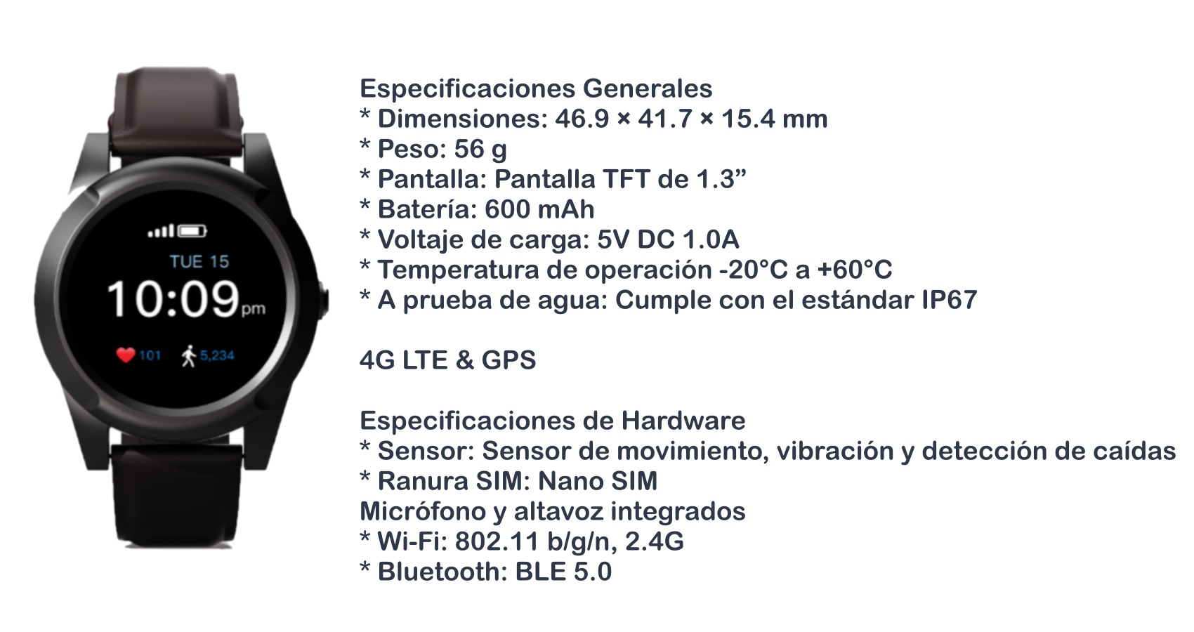 Detección de caídas, botón SOS, llamadas sin celular, monitoreo de salud, zonas seguras, historial de recorridos y seguimiento constante.